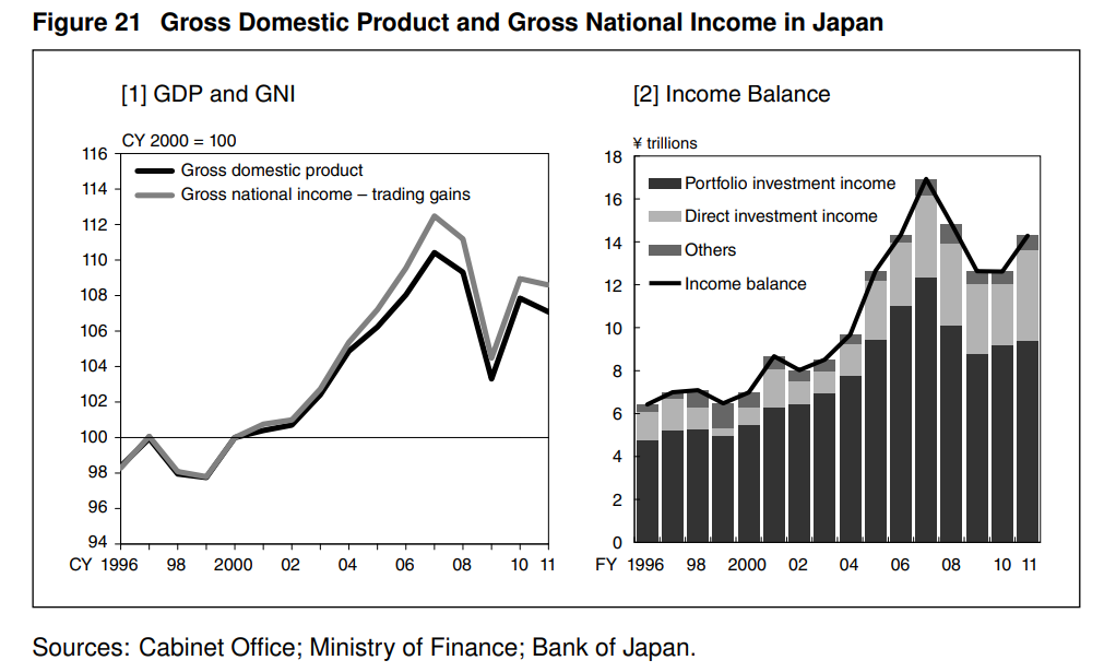 滿足外國需求的選擇之一是出口,其他還包括,支持日本企業的對外直接投資,以追求更高的盈利能力,這將帶來收入盈餘。21世紀頭十年,實際GDP平均每年增長0.6%,而扣除貿易損益後的實際國民總收入(與實際GDP相對應的指標)增速更快,爲0.7%(圖21)。