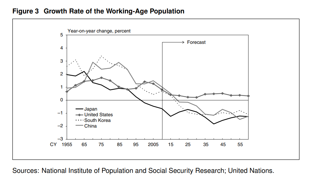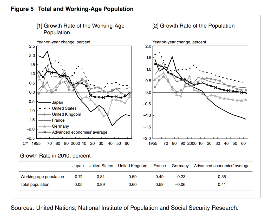 第二,日本人口增長率和勞動年齡人口增長率的快速下降是全球前所未有的。