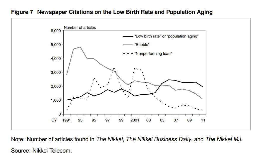 圖7 低出生率與人口老齡化的報紙引文(黑線)