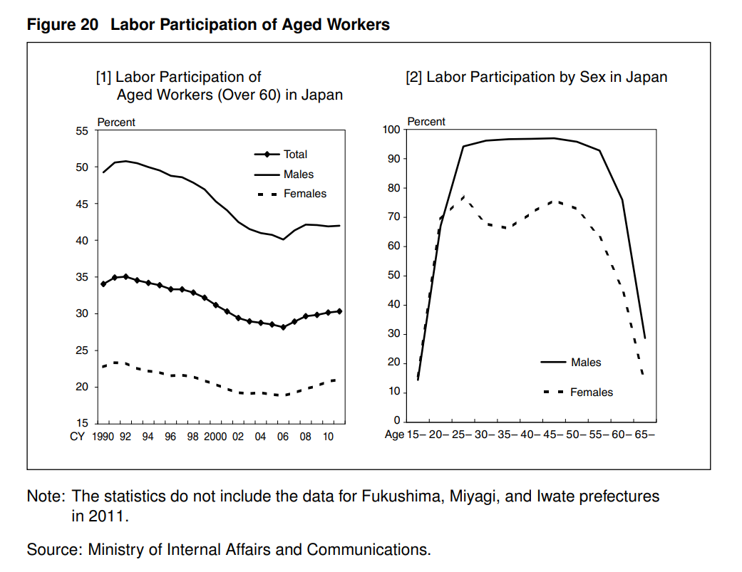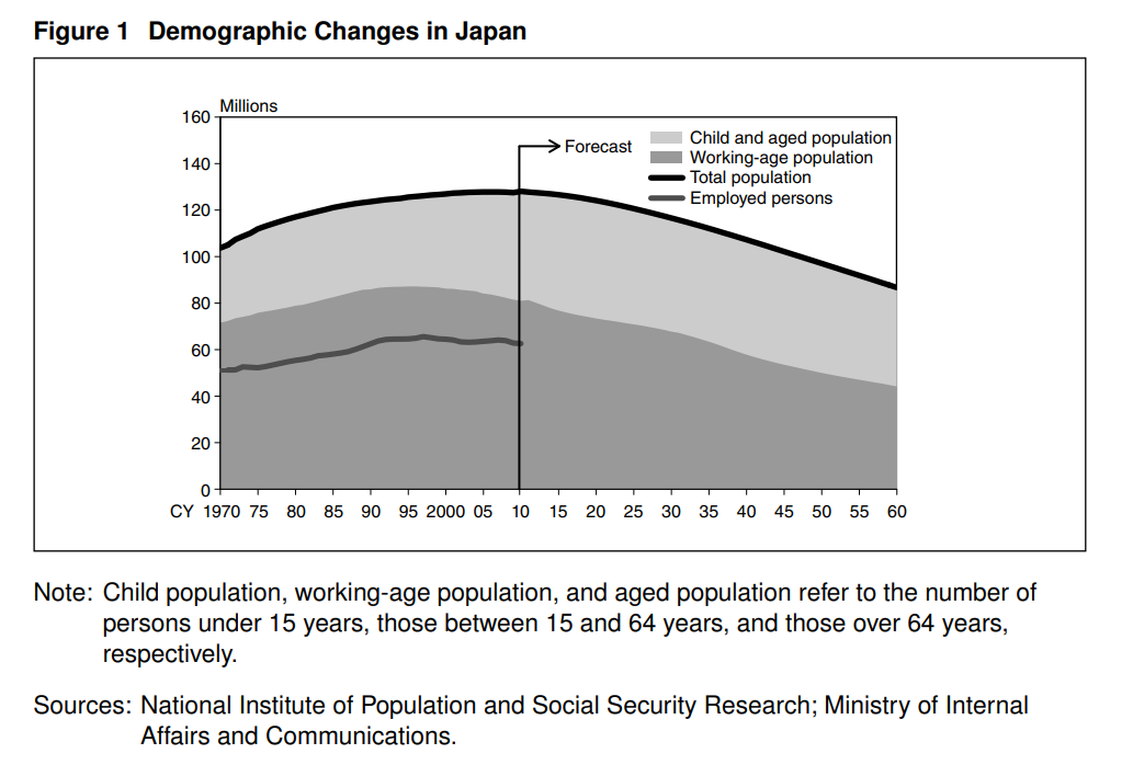 日本的人口和工作年齡人口(15歲到64歲之間的人口)分別在2007年和1995年達到頂峯後開始下降。65歲及以上人口的比例從1990年的12%迅速上升到2010年的23%(圖1)。