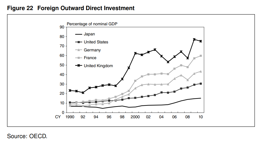 圖22 對外直接投資(黑實線爲日本,遠低於其他發達國家)