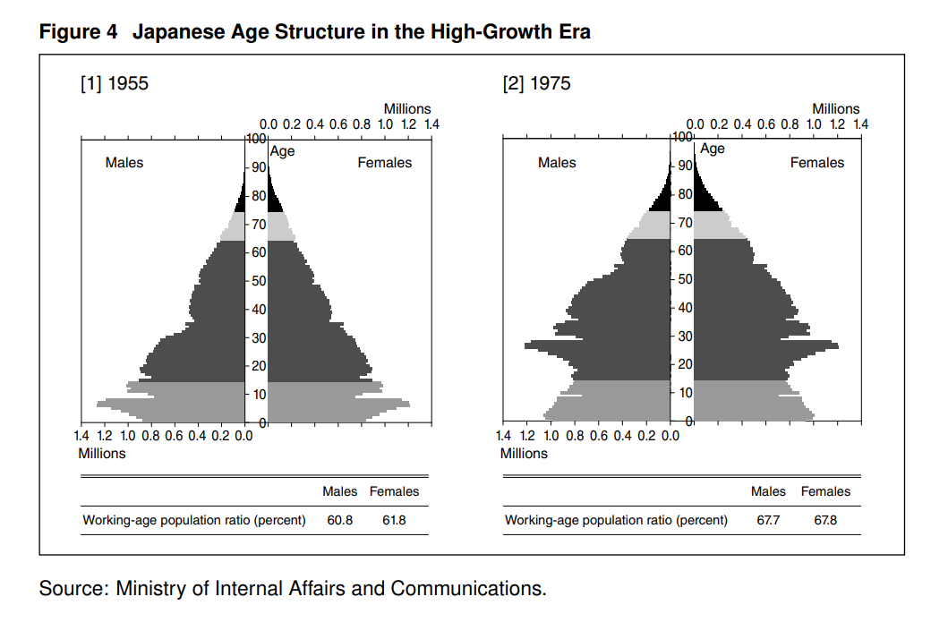 勞動年齡人口的擴大,加上自由貿易體制,爲快速增長提供了堅實的基礎。將日本人口在高增長時期開始和結束時按年齡組別進行的比較清楚地表明,在這一時期,日本的工作年齡人口出現了快速增長。