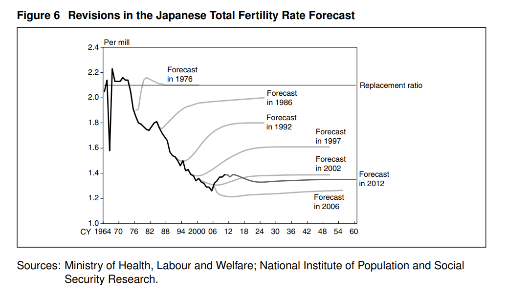 自1976年以來,這種預測一直用於日本公共養卹金制度的精算估值(圖6)。在1992年之前人們甚至認爲,長期生育率會適時上升到2,直到1992年預測才第一次被向下修正,遠低於2。