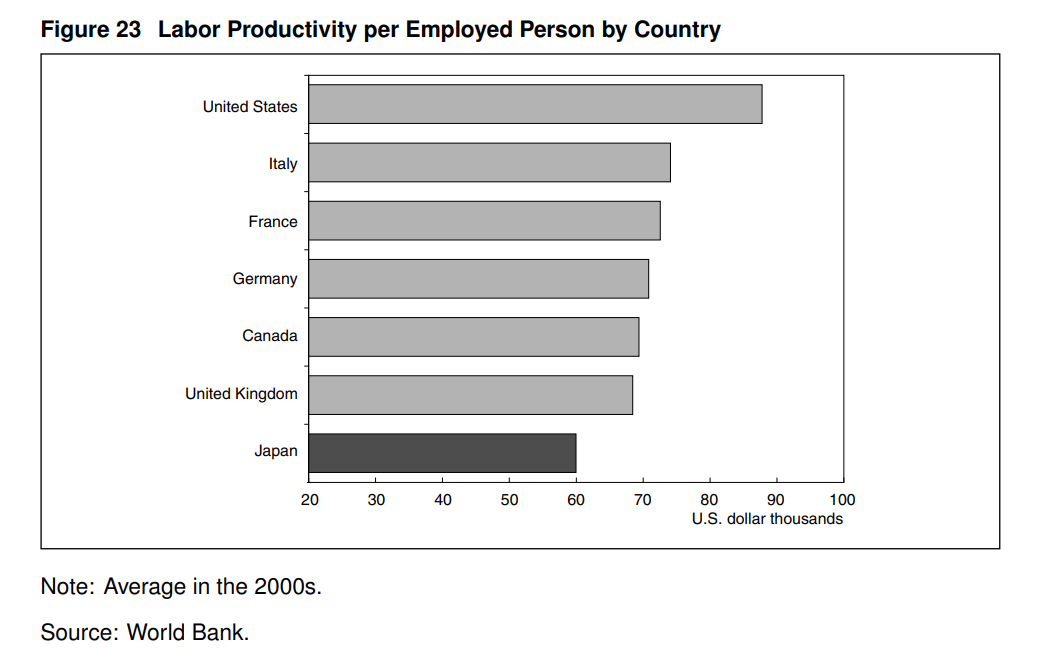 最後,企業可以根據上述三種選擇更好地重新配置資本,以提高生產率。我上面提到了日本勞動生產率的增長率,現在我指出日本的勞動生產率水平低於其他發達國家(圖23)。換句話說,如果企業重新配置其資本,使其更好地與有效配置相匹配,人均收入可能會大幅增加。