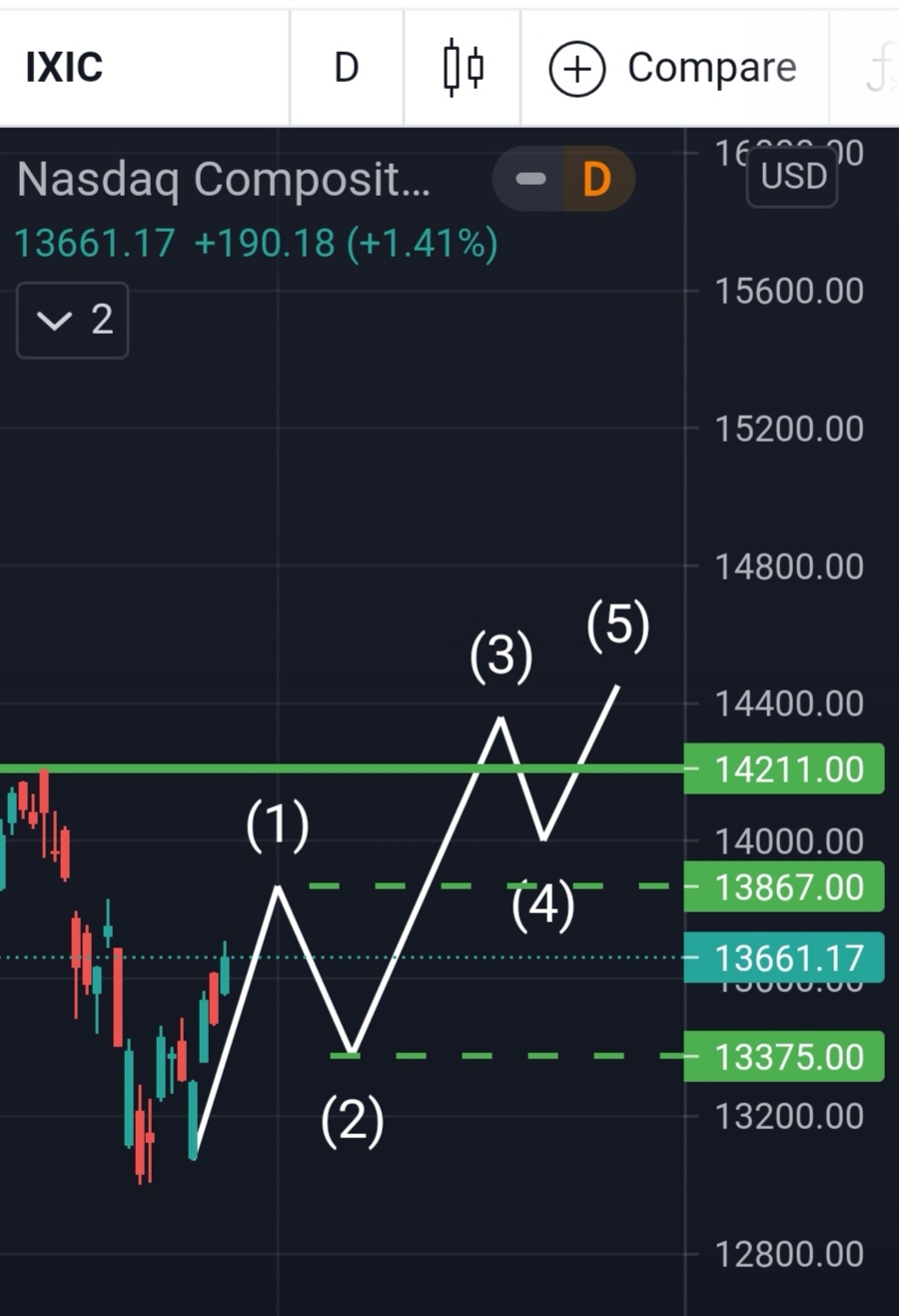 當然,到了13830之後要漲到前高,會先有回調。這回調的幅度會影響下一波的上漲。這回調不能跌破13375, 最好在13400-13600之間。跌完後在往上漲一波,突破前高。[勝利]