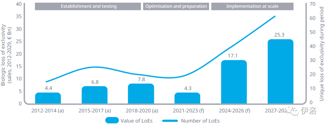 Exhibit Notes: Biosimilar entry takes into account instances where loss of exclusivity occurs before biosimilars have been authorised for use in Europe, or where sales are present before time to authorisation. The European baseline for biosimilar entry is usually based on the limiting factor of these two components.