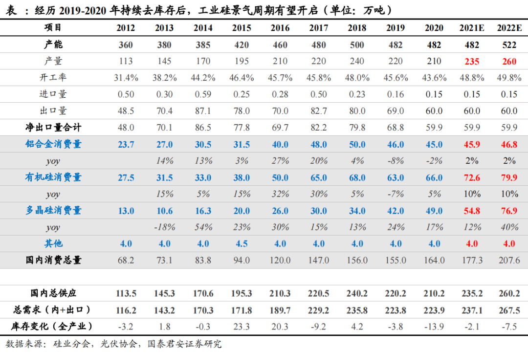 根據國泰君安綜合測算,2021、2022年,工業硅總需求量分別爲235.2萬噸和260.2萬噸,持續大於總供應,供需缺口持續放大。
