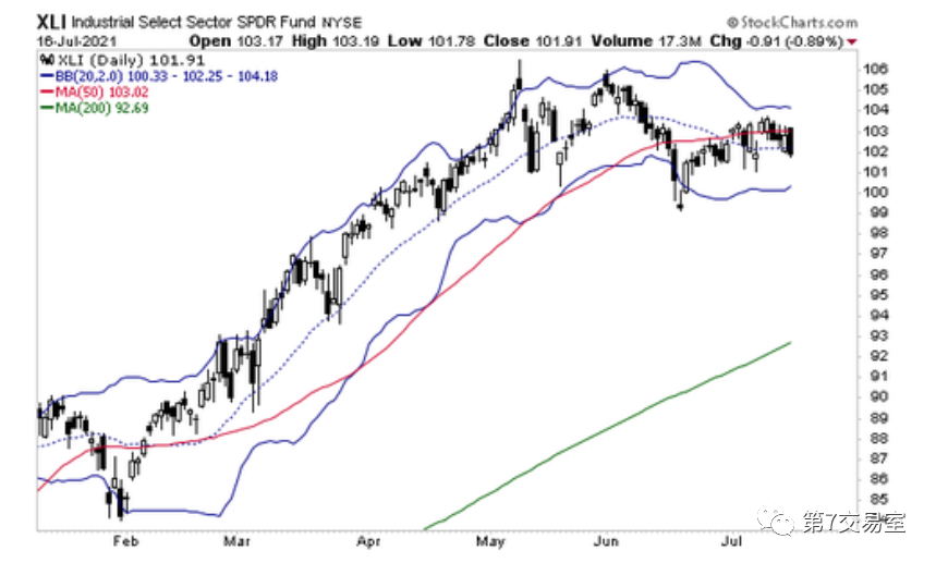 首先看工業(XLI)。這些公司要麼是生產拖拉機、起重機的、要麼是參與實際經濟活動的搞運輸的。它們的走勢反應了實體經濟的表現:如果他們獲得了更多的市場訂單,這次的調整應該很快恢復。