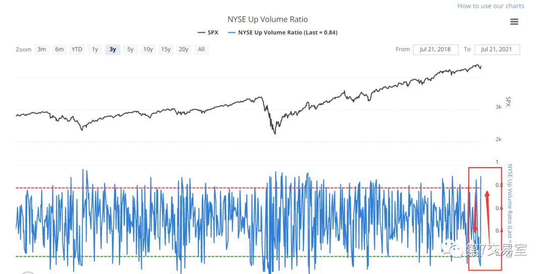 近兩天來的反彈比較給力,幾乎抹平了一週前的跌幅,三個指數全都企穩在50日均線上,納指更是站上了20日線。而且從納指的漲跌成交量指標看,大跌第二天反彈的動能特別大,納指成分股中,上漲的成交量佔比從15%飆升到了90%