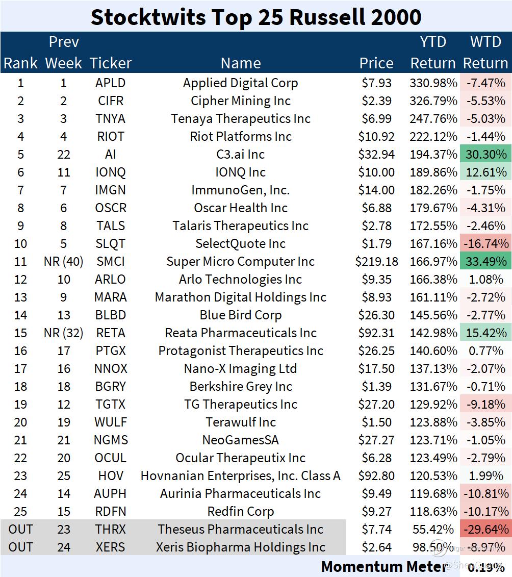 Even the Russell 2000 – comprising of small cap stocks – shows the same effect, albeit at a vastly attenuated net momentum contribution. Diminutive C3.ai Inc ( $C3.ai, Inc.(AI)$ ) and Super Micro Computer Inc (NASDAQ: SMCI) showed a vast rally to close the hemorrhaging small-cap segment with a minute net positive momentum of 0.19% among its Top 25 momentum contributors.