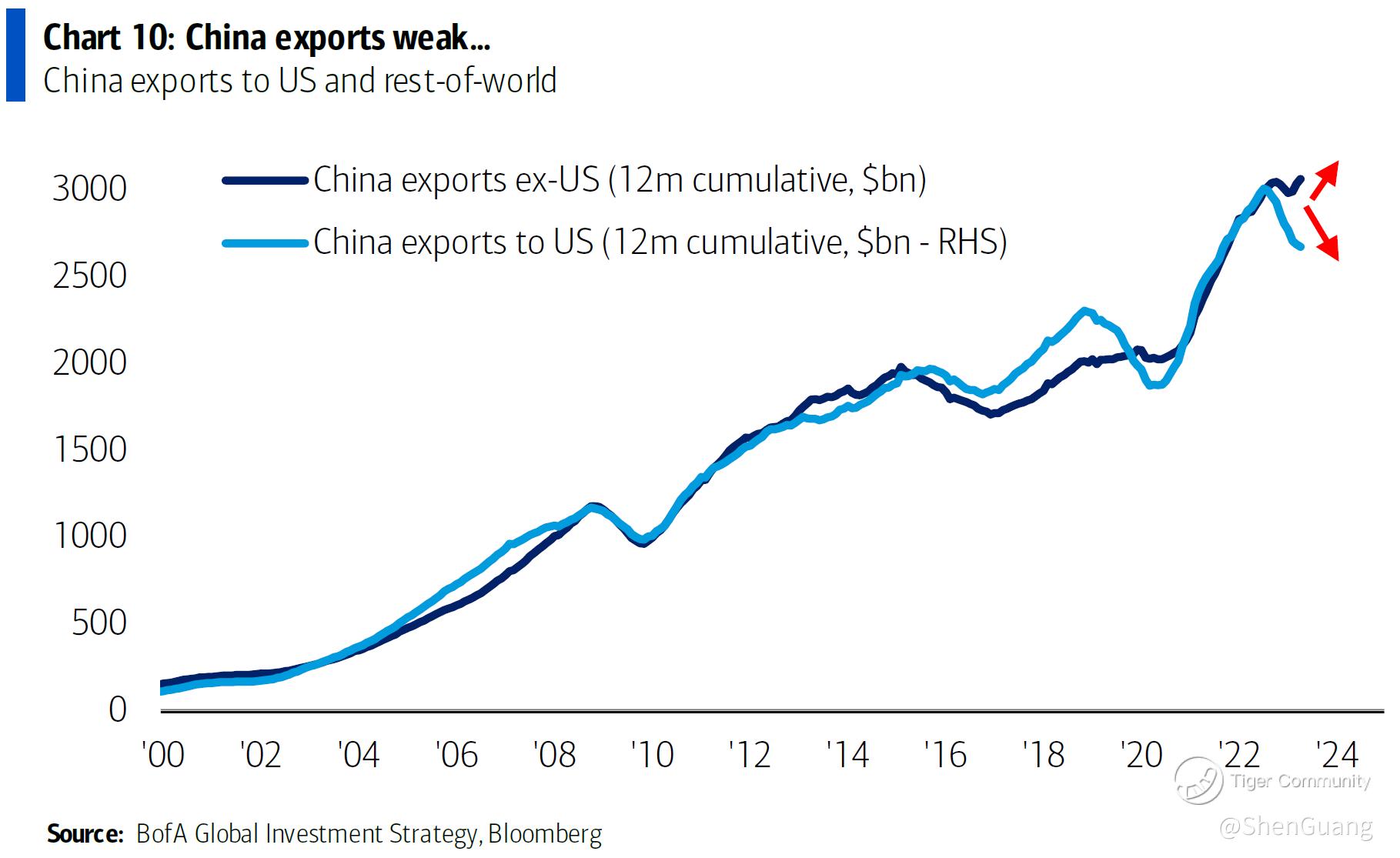 There’s a hint of this effect even in exports from China to the U.S. and the rest of the world.