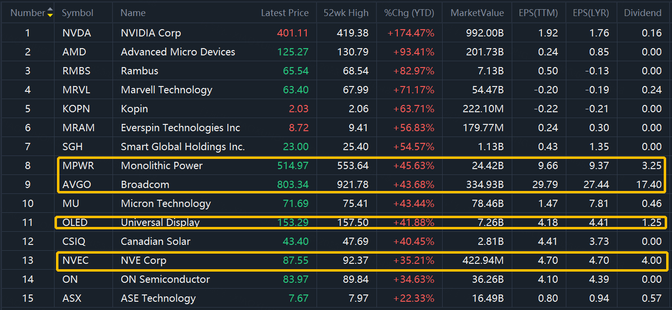 As of Tuesday's close, 15 stocks of the 73 semiconductor industry hit new highs in 2023, They are: $NVIDIA Corp(NVDA)$, $Advanced Micro Devices(AMD)$,$Rambus(RMBS)$,$Marvell Technology(MRVL)$, $Kopin(KOPN)$ , $Everspin Technologies Inc(MRAM)$ , $Smart Global Holdings Inc.(SGH)$ , $Monolithic Power(MPWR)$ ,$Broadcom(AVGO)$ , $Micron Technology(MU)$ , $Universal Display(OLED)$ , $Canadian Solar(CSIQ)$ ,$NVE Corp(NVEC)$ , $ON Semiconductor(ON)$ , $ASE Technology(ASX)$