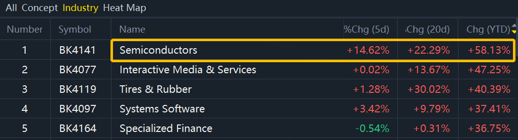 As of the trading day on May 30, the semiconductor industry has also become the industry with the highest 2023 YTD in the US stock industry.