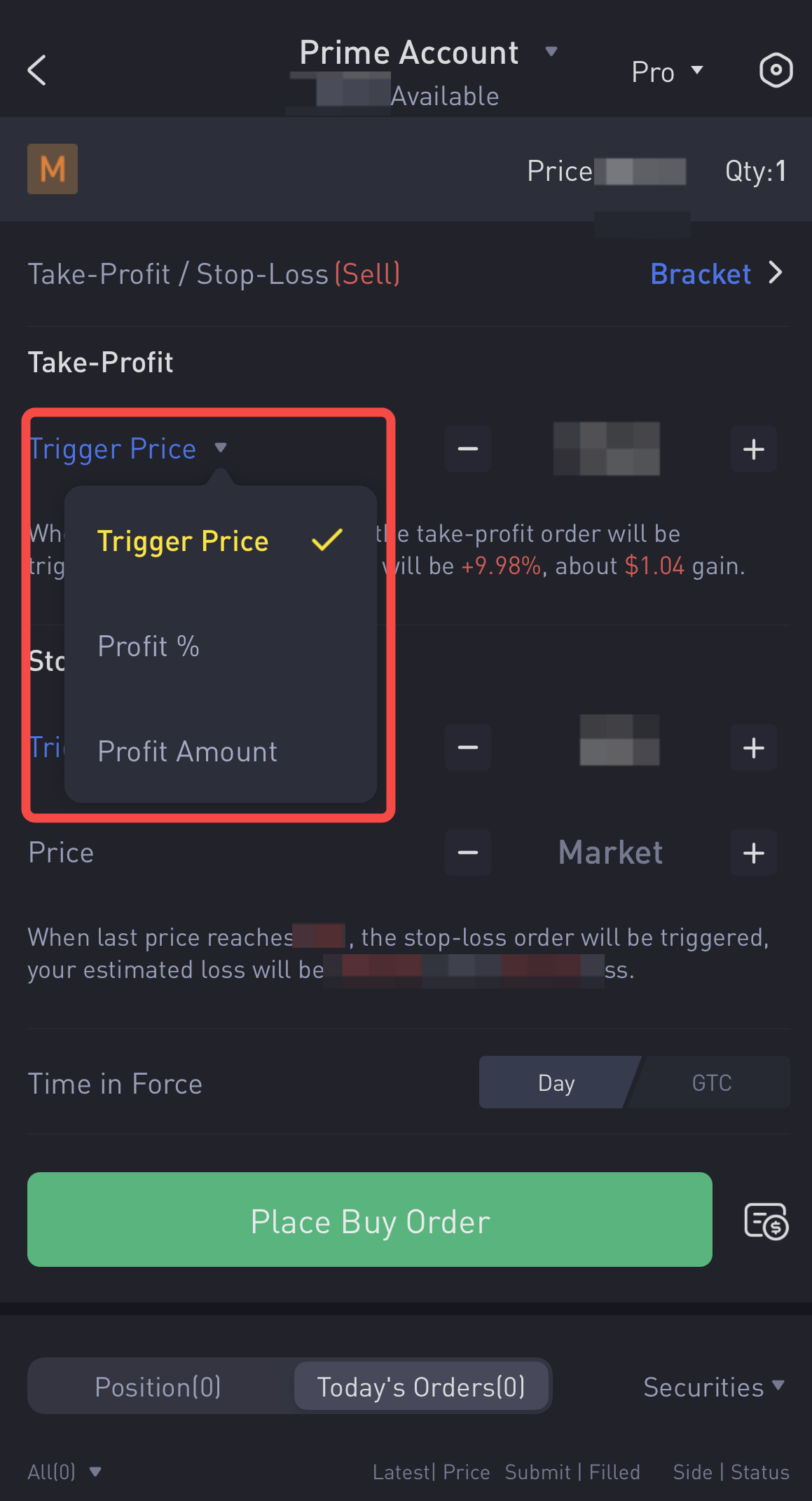 You can set the take-profit and stop-loss points by selecting "Trigger Price," "Profit/Loss Percentage," or "Profit/Loss Amount." Once set, click on "Place Order."