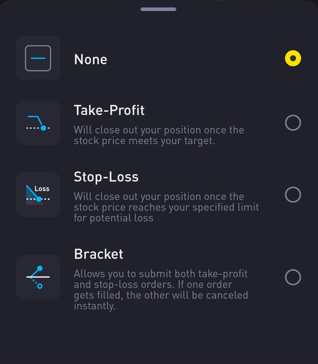 Tiger currently provides the functionality to attach stop-loss and take-profit orders to basic orders. Before placing an order, you can configure the stop-loss and take-profit points. You can choose from three types: "Take-Profit," "Stop-Loss Market Order," and "Stop-Loss Limit Order." A master order can have either a take-profit order or a stop-loss order attached, or both. When one order is executed, the other will be automatically canceled.