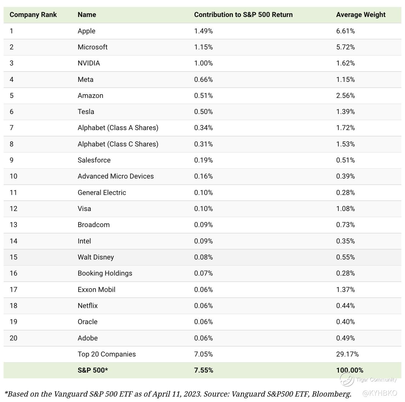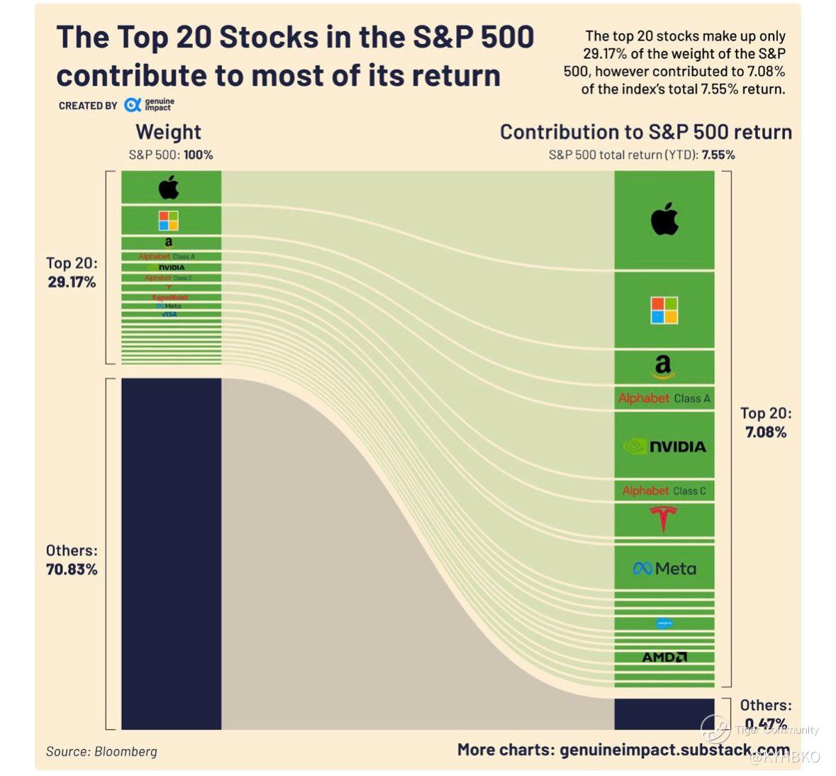 The entire S&P500 has risen 7.55% but the top 20 companies account for 7.05% (from the 7.55% rise). This implies that the rest of the 480+ companies account for 0.55% of S&P500 (from the 7.55% rise).
