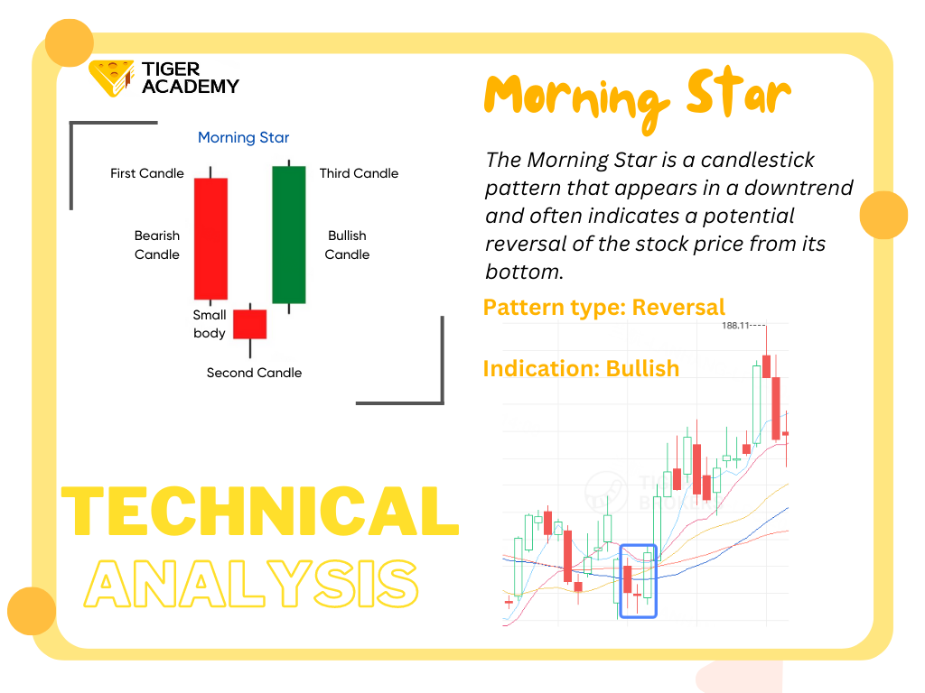 The Morning Star is a candlestick pattern that appears in a downtrend and often indicates a potential reversal of the stock price from its bottom.