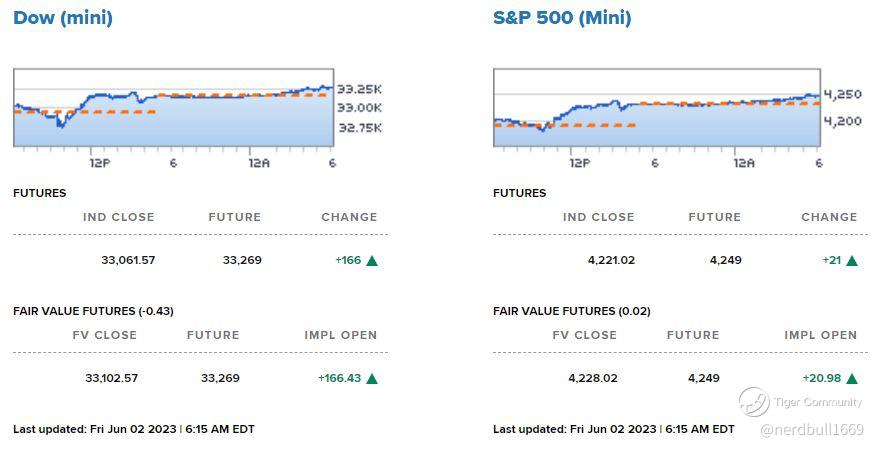 Today (02 June 2023) the premarket futures is higher, as investors are positive after US default threat is ending with senate passed legislation to suspend the US debt ceiling and believe that a rate hike pause in June might be in the horizon.