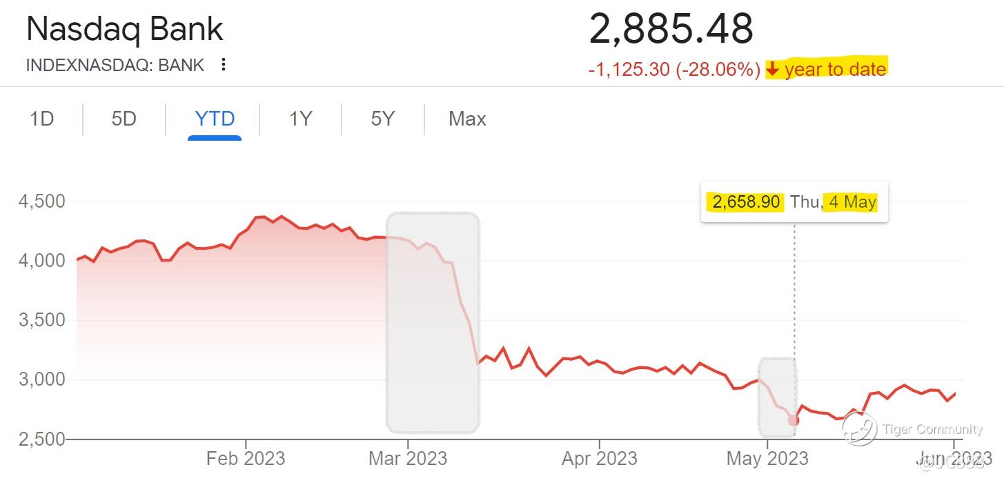 The steepest plunge occurred in Mar 2023 (bank run), followed by a smaller fall in May 2023 (US debt limit).