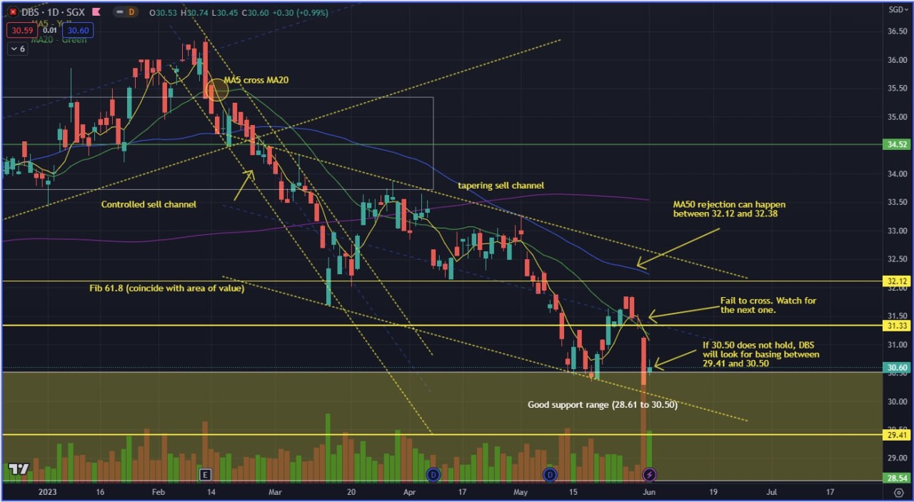 For DBS, it's interesting to note the tapering controlled sell channel and the testing of the lower end. The key level at 30.50 seems to be holding strong, providing support for the stock. Your tactical Dollar cost averaging strategy between 30.50 and 29.41 sounds like a smart move. Let's see how the basing formation develops and if the resistance at 32.12 can be broken in the future.
