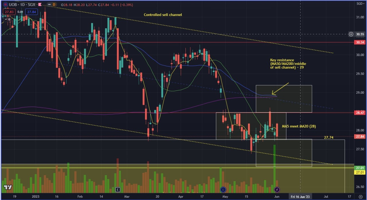 Turning to UOB, the building of an area of balance between 27.74 and 28.47 is worth keeping an eye on. The fact that it hasn't broken through 27.74 since mid-May is a positive sign. The possible Inverse Head and Shoulder formation adds to the potential support at 27.74. It'll be interesting to see if the stock stays within this range or moves lower to reinforce the basing. Your planned Dollar cost averaging strategy between 27.74 and 27.01 is a wise approach.