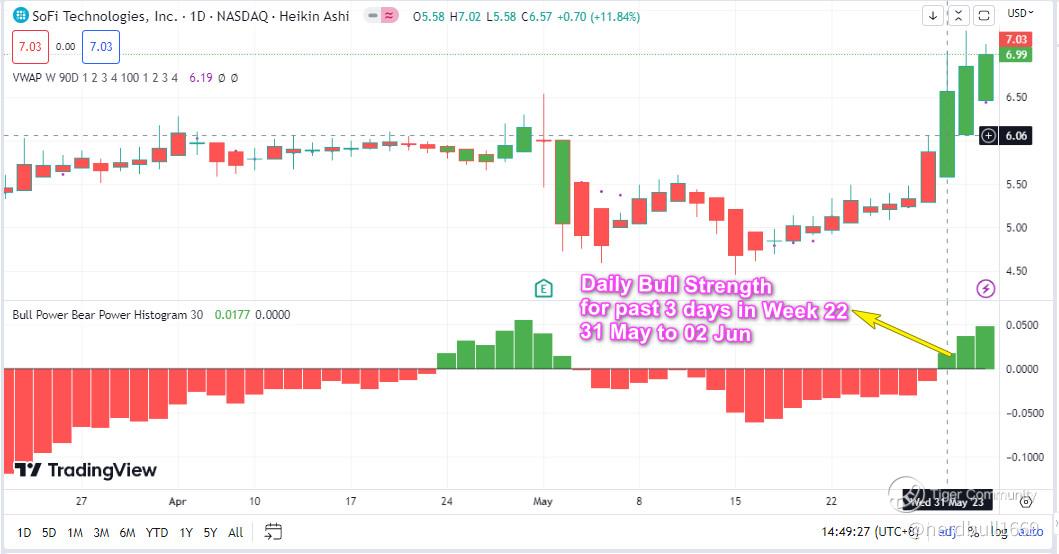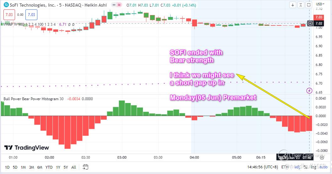 As seen in after hours trading, it is Bear strength from Bull/Bear power, we need to see a change to Bull strength in early hours of Monday (05 June) premarket before we can see if investors are interested and will have more faith in SOFI.