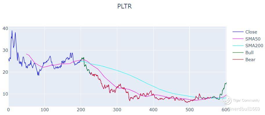 Using data over 600 trading days, we can see that PLTR just begin its Bull trend, it is not very strong.