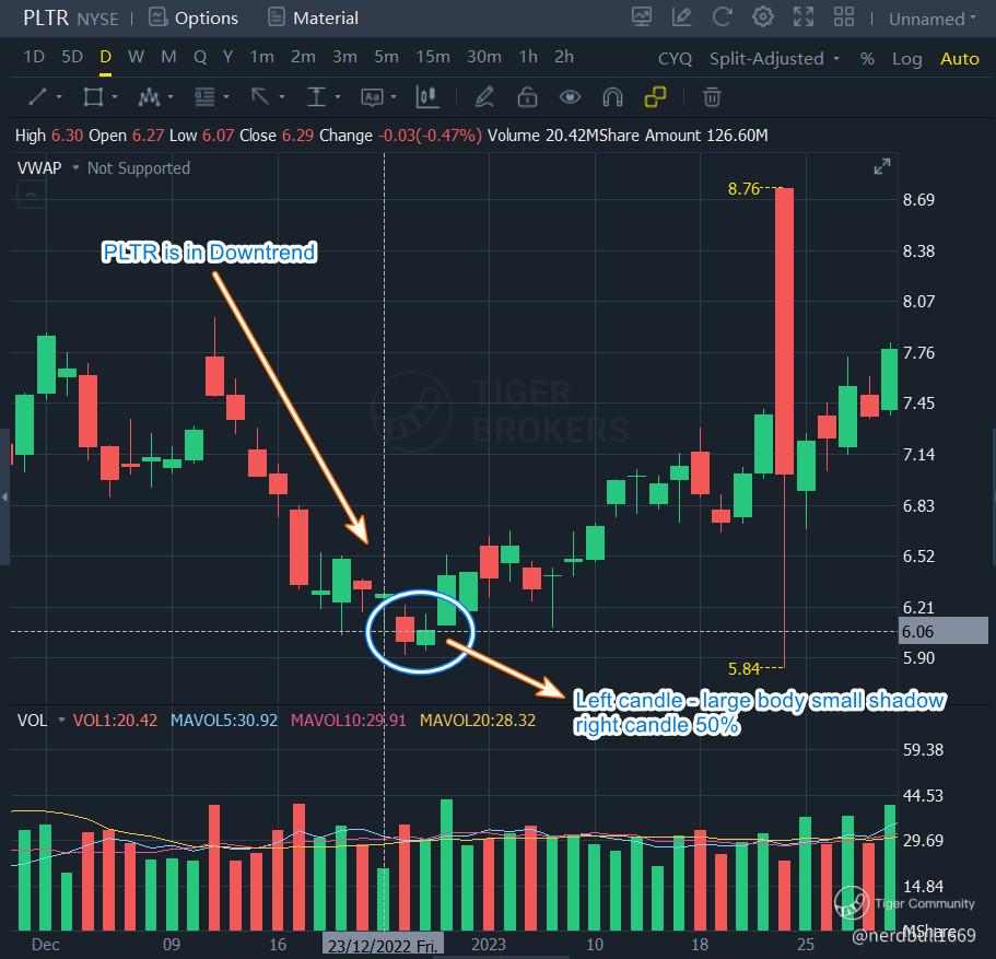 As you can see PLTR was in a downtrend before 27 Dec 22, when the bearish candle appear on 27 Dec, we have a bullish candle on the next day, this would give us an indication that a bullish trend is going to come.