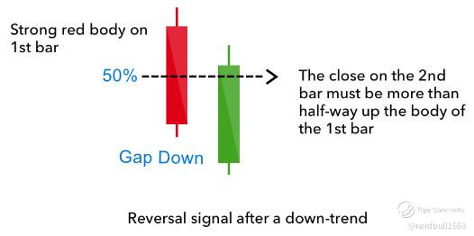 First candle (Bearish candle) will be followed by a Bullish one (denote by Green candle). It close 50% above the previous close (small gap)