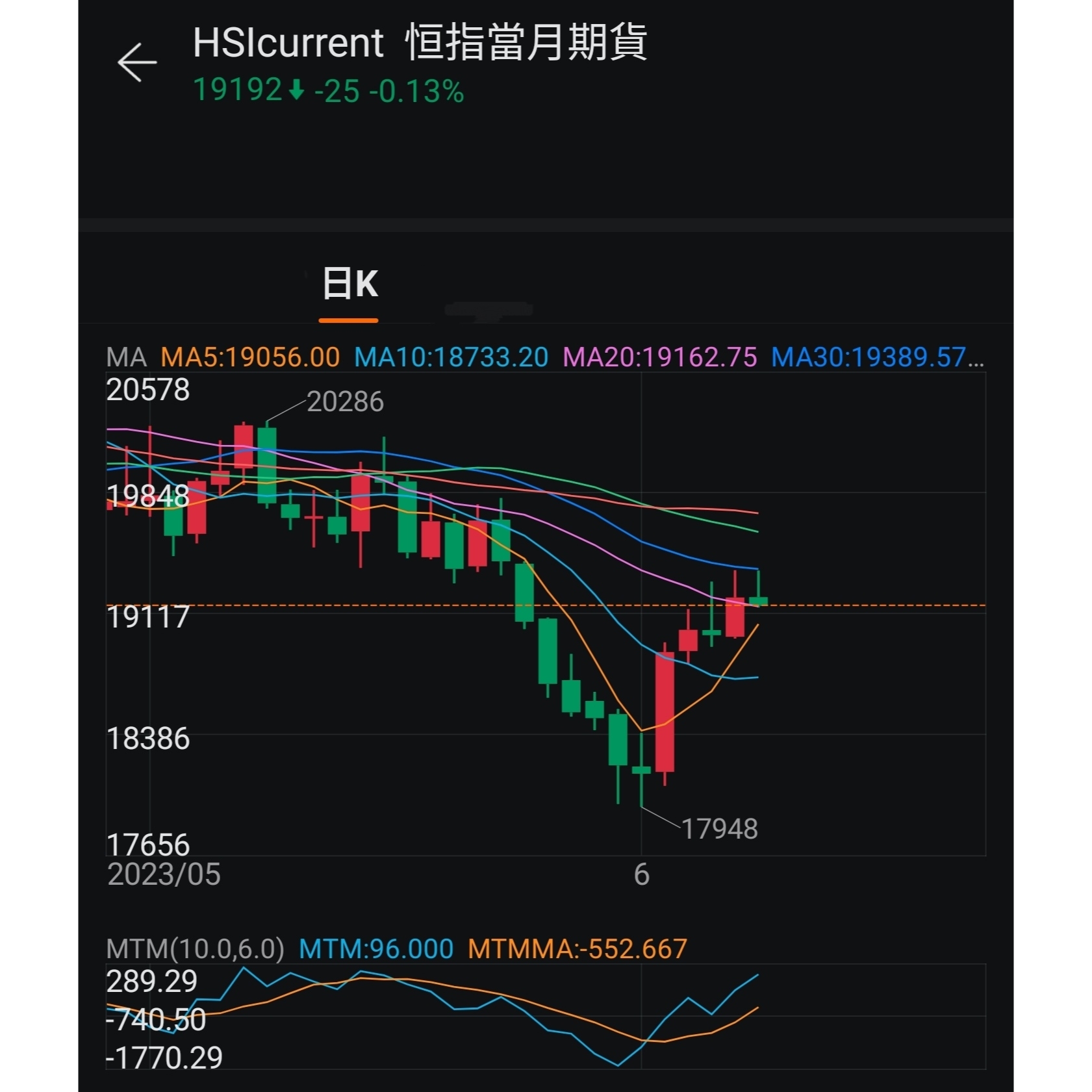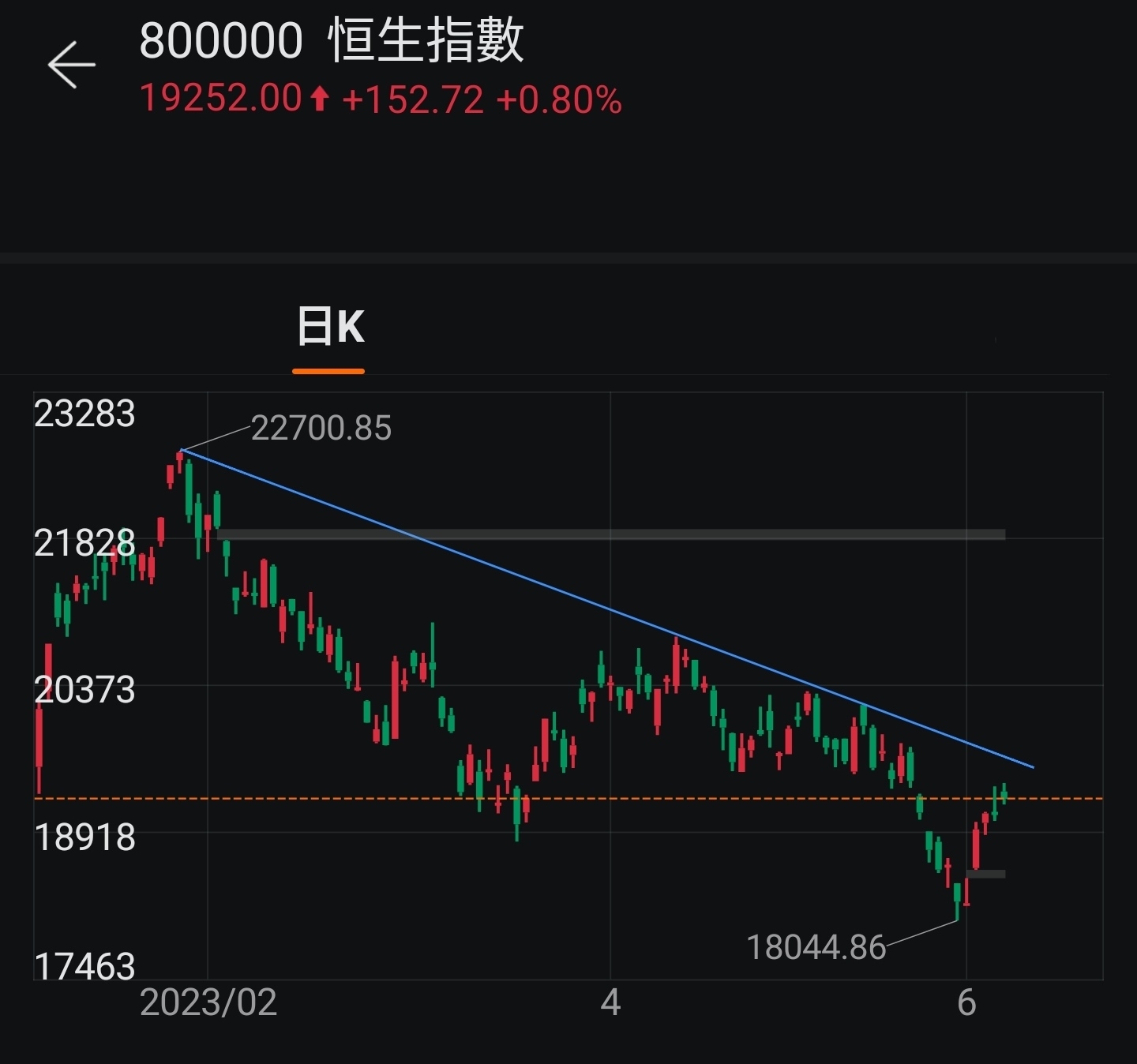 (從新上市牛熊證收回價來看,恆生指數此次反彈應未完結,只要能夠穩守10天日線水平,理應可進一步向上衝高至19500點水平),往後能否轉強勢就要看能否突破由2023年1月27日至4月17日及5月16日向下延伸之下降軌了)