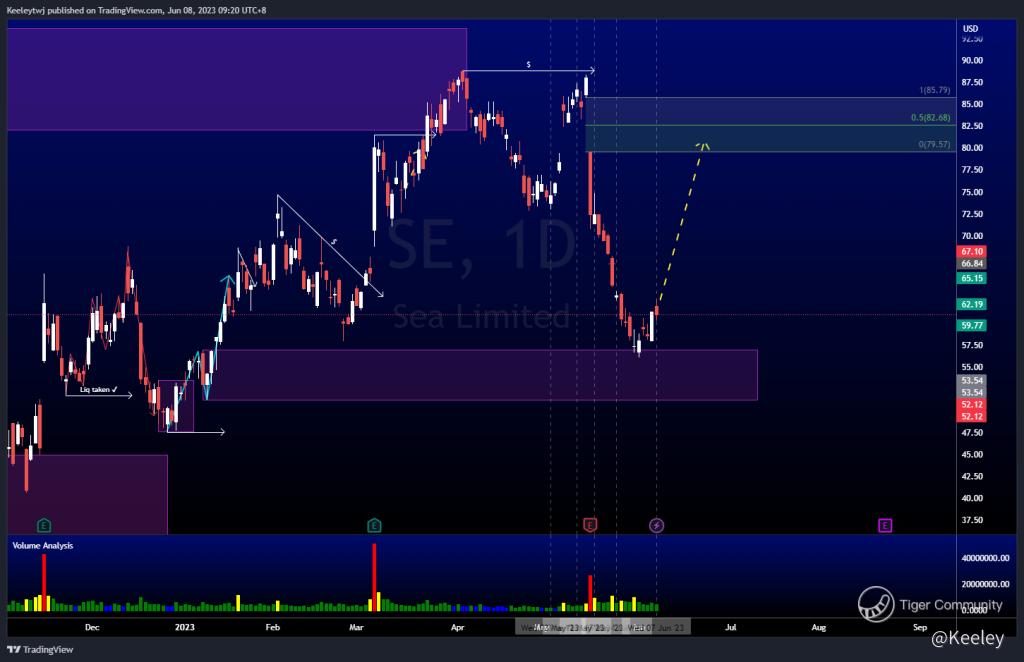Price did not play out as analyzed last week. However, price mitigated an old order block at 56.95, giving a nice 7.20% reaction off it. From here, I'm expecting price to continue higher, at least to fill the 50% fair value gap at 82.68.