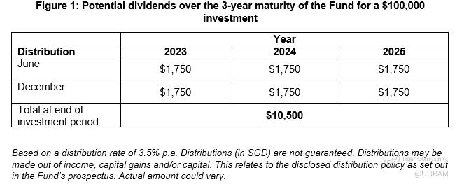 (1) Based on a distribution rate of 3.5% p.a. Distributions (in SGD) are not guaranteed. Distributions may be made out of income, capital gains and/or capital. This relates to the disclosed distribution policy as set out in the Fund’s prospectus. Actual amount could vary.