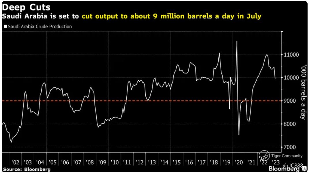 In an attempt to halt the falling oil price that is creating a big headache for Saudi Arabia, they have decided unilaterally to cut oil production by 9 Million bpd (newly revised goal) from July 2023 onwards.