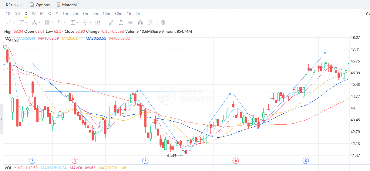Between February and August 2018, Coca-Cola formed an inverted head and shoulders technical pattern, indicating that Coca-Cola's bearish forces had weakened and its upward expectations were gradually strengthening.