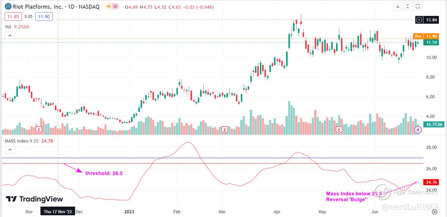 Bulge: When the Mass Index rises above the 27-28 level, it signifies a "bulge." This indicates that the trading range is widening, suggesting a potential reversal may be on the horizon.