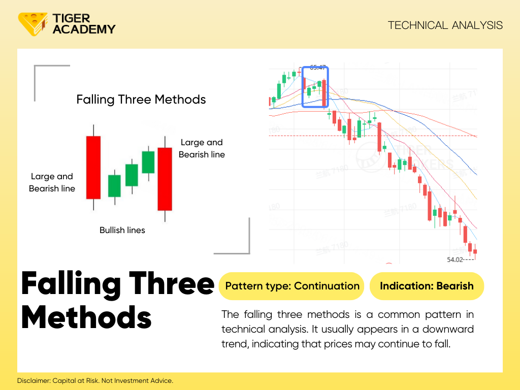 The falling three methods is a common pattern in technical analysis. It usually appears in a downward trend, indicating that prices may continue to fall.