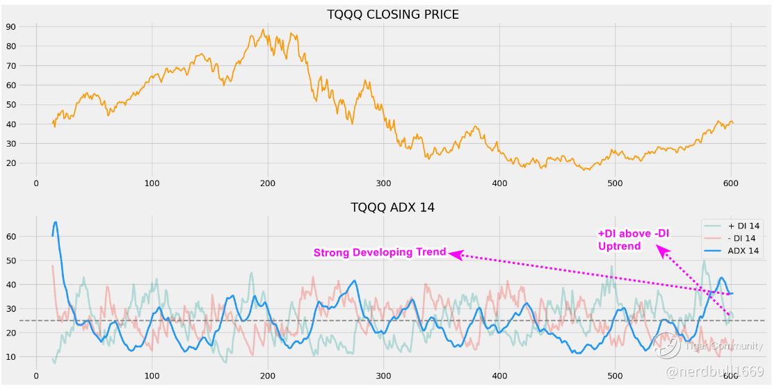 TQQQ look to be in a bullish developing trend and +DI above -DI indicate a good uptrend.