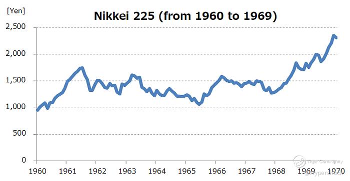 From 1960, it frequently goes up and down, crossing the 1,500 yen mark several times before reaching 2,400 yen in 1970