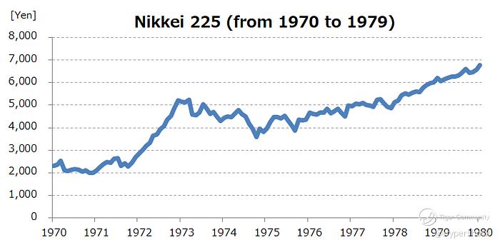 From 1970, it stays steady until near the end of 1971, it increases a lot to 5,000 yen and goes back down. It later increases, reaching to 7,000 yen in 1980. This is the first major increase, increasing more than 3 times of what it started off with in the start of the decade.