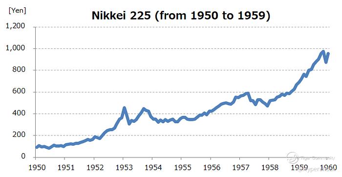 It starts off from around 100 and has steady growth, going to 1000 yen in 1960