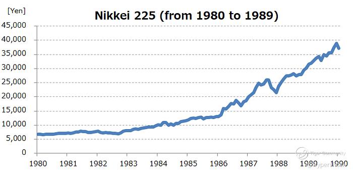From 7,000 yen, it stays steady until 1983. From here, it increases a lot to almost 15,000 yen. But from here, it increases very quickly to 38,915 yen, the highest price ever in 1989
