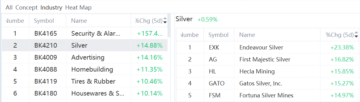 The market’s optimistic tone continued on the back of better-than-expected inflation results. The best-performing concepts are security & alarm services, silver and advertising.