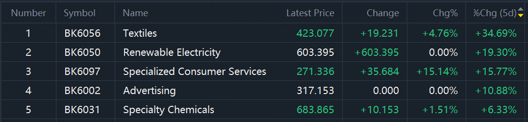 Textiles, Renewable Electricity, Specialized Consumer Services, Advertising, Specialty Chemicals.