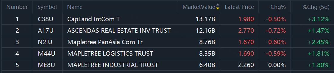 $CapLand IntCom T(C38U.SI)$ , $ASCENDAS REAL ESTATE INV TRUST(A17U.SI)$ , $Mapletree PanAsia Com Tr(N2IU.SI)$ , $MAPLETREE LOGISTICS TRUST(M44U.SI)$ , $MAPLETREE INDUSTRIAL TRUST(ME8U.SI)$