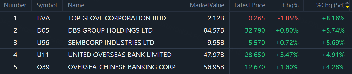 $TOP GLOVE CORPORATION BHD(BVA.SI)$ , $DBS GROUP HOLDINGS LTD(D05.SI)$ , $SEMBCORP INDUSTRIES LTD(U96.SI)$ , $UNITED OVERSEAS BANK LIMITED(U11.SI)$ , $OVERSEA-CHINESE BANKING CORP(O39.SI)$ .