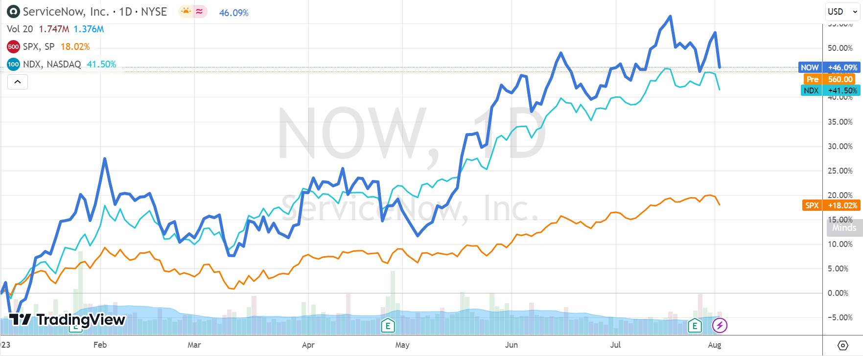 Despite the 2% post-market drop, it is undeniable that ServiceNow (NOW) has outperformed the $S&P 500(.SPX)$ this year, even surpassing $NASDAQ 100(NDX)$