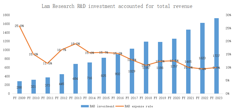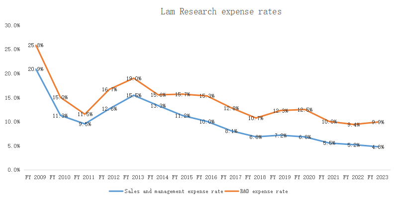 At present, the Lam Research sales and management expense rate is only 4.8%, and the R&D expenditure rate is 9.9%, both of which are significantly lower than in fiscal year 2009: