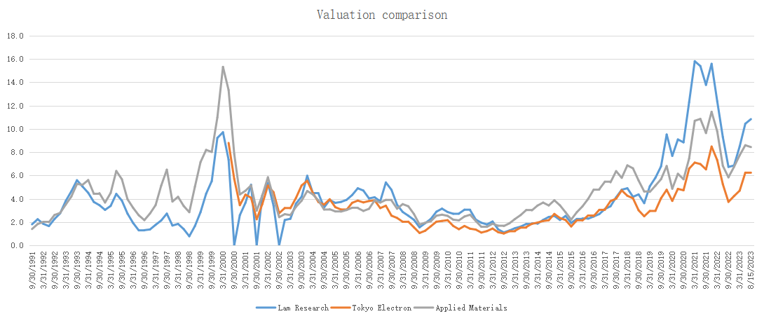 As semiconductor applications become more extensive, the performance volatility of semiconductor equipment factories has also declined sharply. For example, in the semiconductor downward cycle around 2000, Lam Research revenue fell by as much as 38%, and fell 55% during the financial crisis in 2008. In 2018 and this round of semiconductor downside cycle, Lam Research revenue fell by only about 15%.