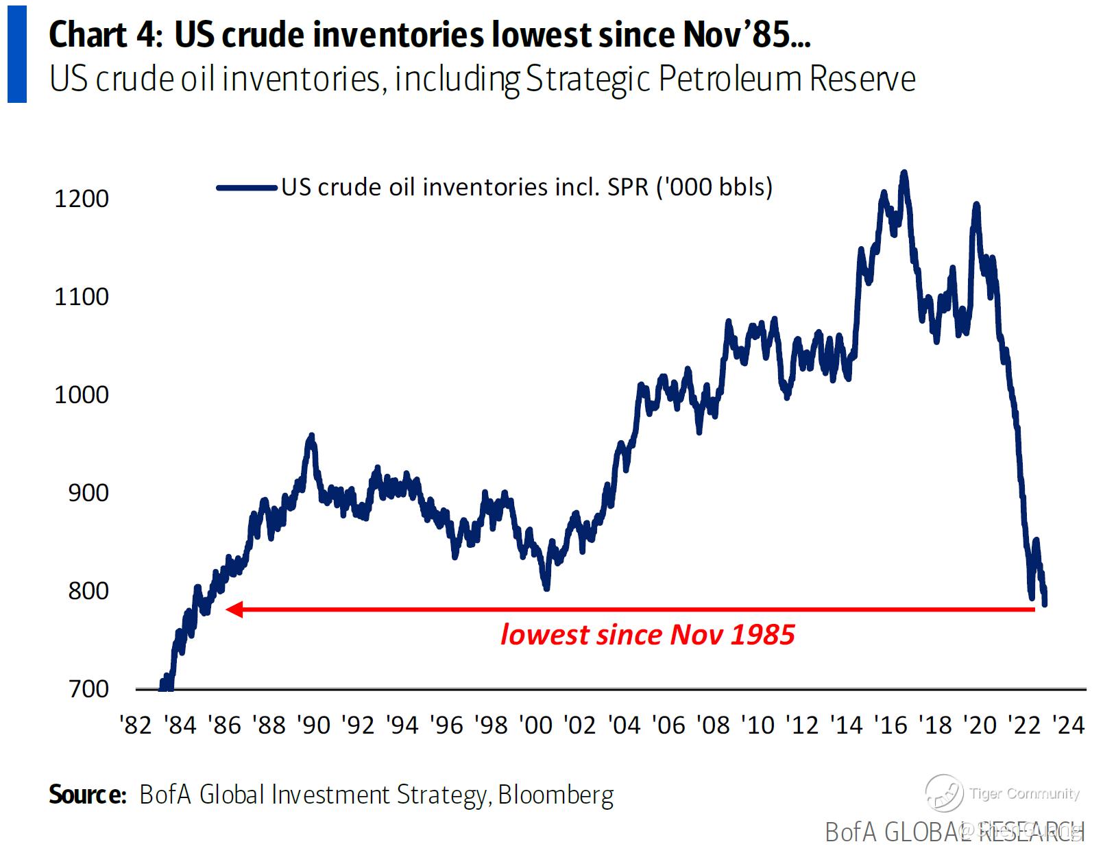 The relative tightness and overdependence on US debt can also be indirectly assessed by US crude oil reserves, including the Strategic Petroleum Reserve, are at lows not seen since 1985 and are even lower after the massive selloff executed in 2022.