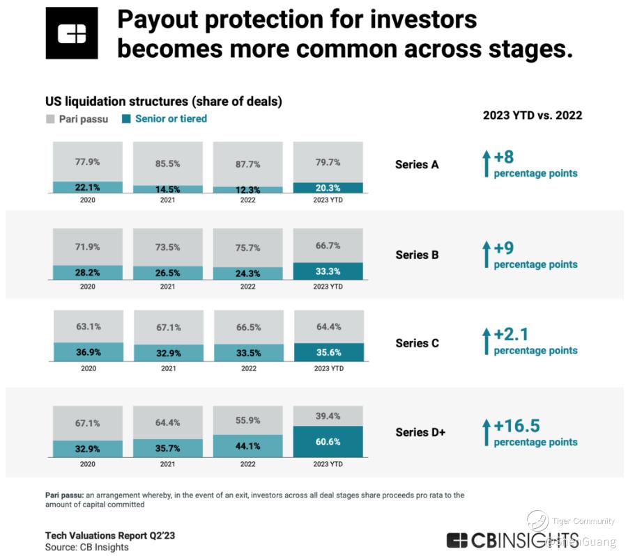 • Deals negotiated with seniority or tiered liquidation structures gained share across every stage from Series A to Series D+ in H1’23.